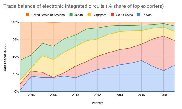 China's largest import is foreign manufactured IC’s and China doesn’t have a clear path to supply its own IC needs in the foreseeable future. Intel is the last CPU integrated device manufacturer (IDM) in the US and has been missing key development milestones and is being outpaced by TSMC and Samsung. Business for Taiwan Semiconductor has been booming. In Q4 2020, TSMC accounted for 56% of global chip manufacturing revenue. This is a particular risk given the historical and present geopolitical risk of China seeking to unify with Taiwan as well as the erosion of US semiconductor manufacturing.